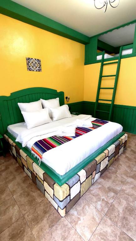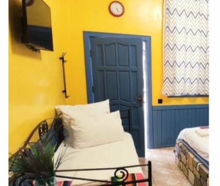 5 осн. мест. Мебель: вешалка, зеркало, кровать двуспальная, кровать односпальная, матрас (2 мартаса на 2-м уровне), прикроватные тумбочки, стол, столик журнальный, стулья, шкаф. Мини-кухня. Оборудование: кондиционер, мультиварка, набор посуды, телевизор, холодильник, электрочайник. Санузел: с душем, туалетные принадлежности, фен. Сервис: Wi-Fi бесплатно, смена полотенец, смена постельного белья, уборка номера.