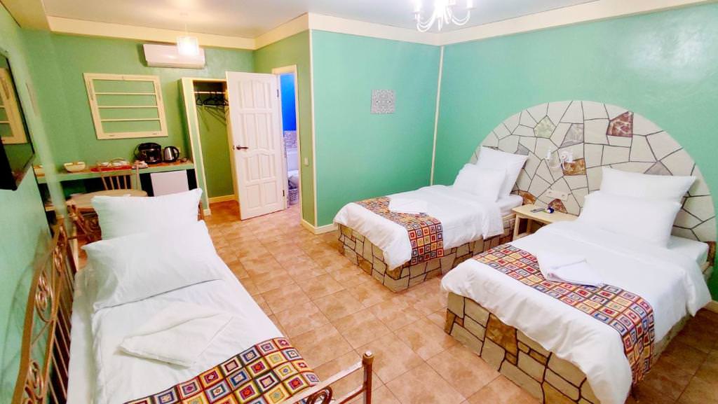3 осн. места. 1 доп. место. Мебель: вешалка, зеркало, кровать двуспальная, кровать односпальная, прикроватные тумбочки, стол, столик журнальный, стулья, шкаф. Мини-кухня. Оборудование: кондиционер, мультиварка, набор посуды, телевизор, холодильник, электрочайник. Санузел: с душем, туалетные принадлежности, фен. Сервис: Wi-Fi бесплатно, смена полотенец, смена постельного белья, уборка номера.